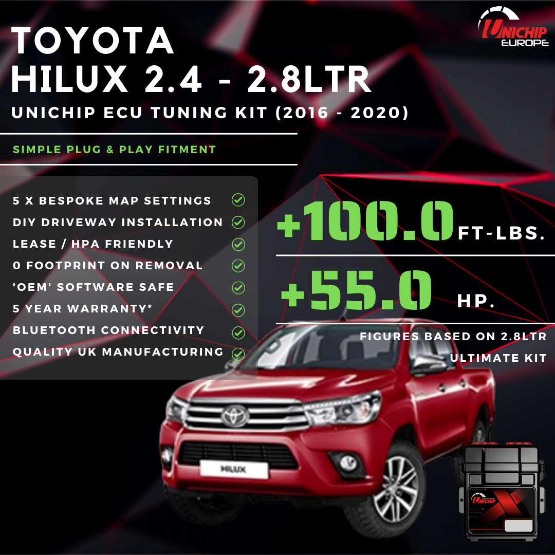 An additional 35 HP & 80 LB-FT can be found with Unichip's Toyota Hilux ultimate ECU Tuning Kit, as well as access to 5 versatile and unique to Unichip map settings - available to switch in real time. (Order your preferred switch separately). Basic kit also available with one performance tune giving an increase of 20bhp and 44 ft lb of torque.